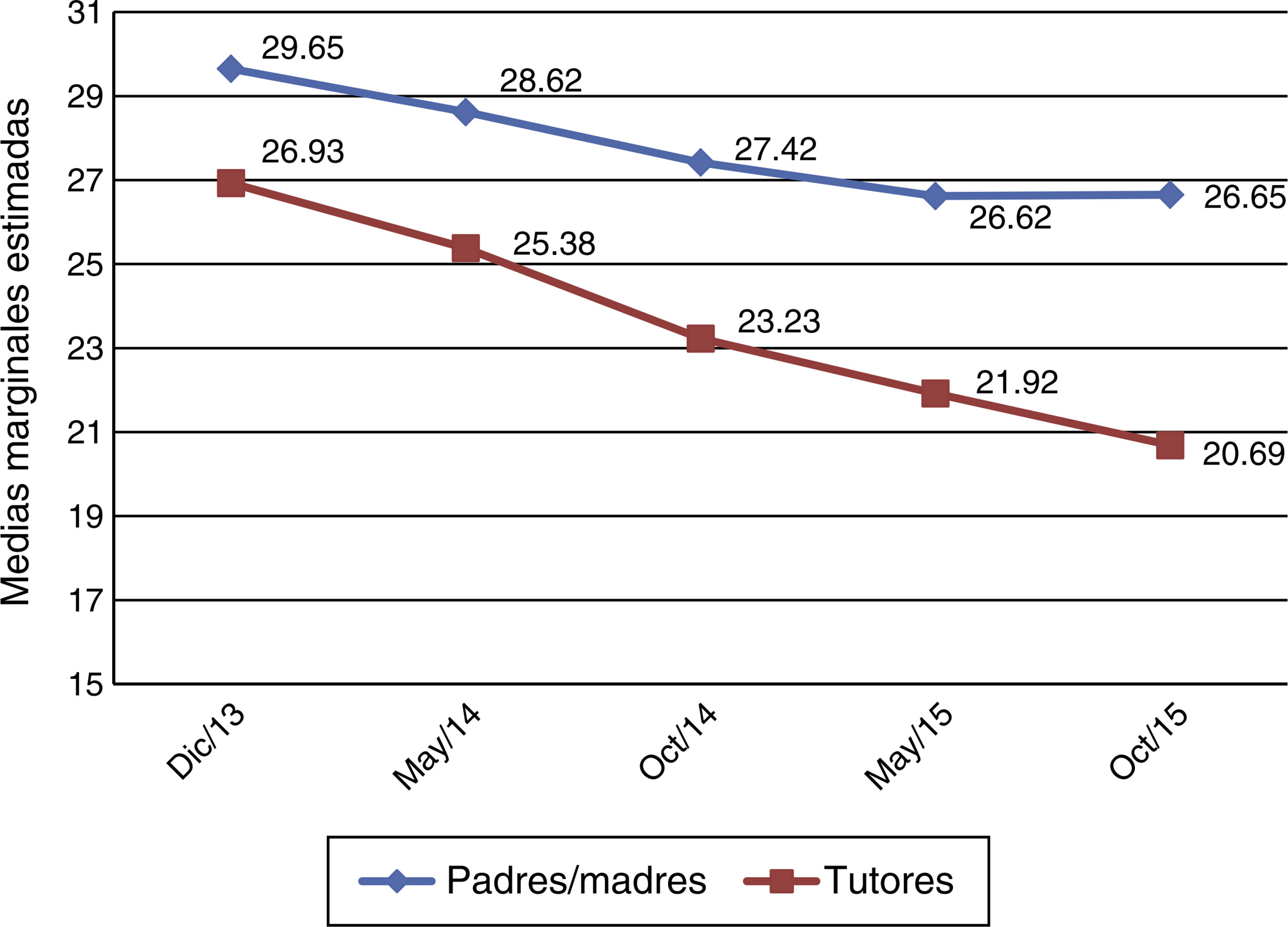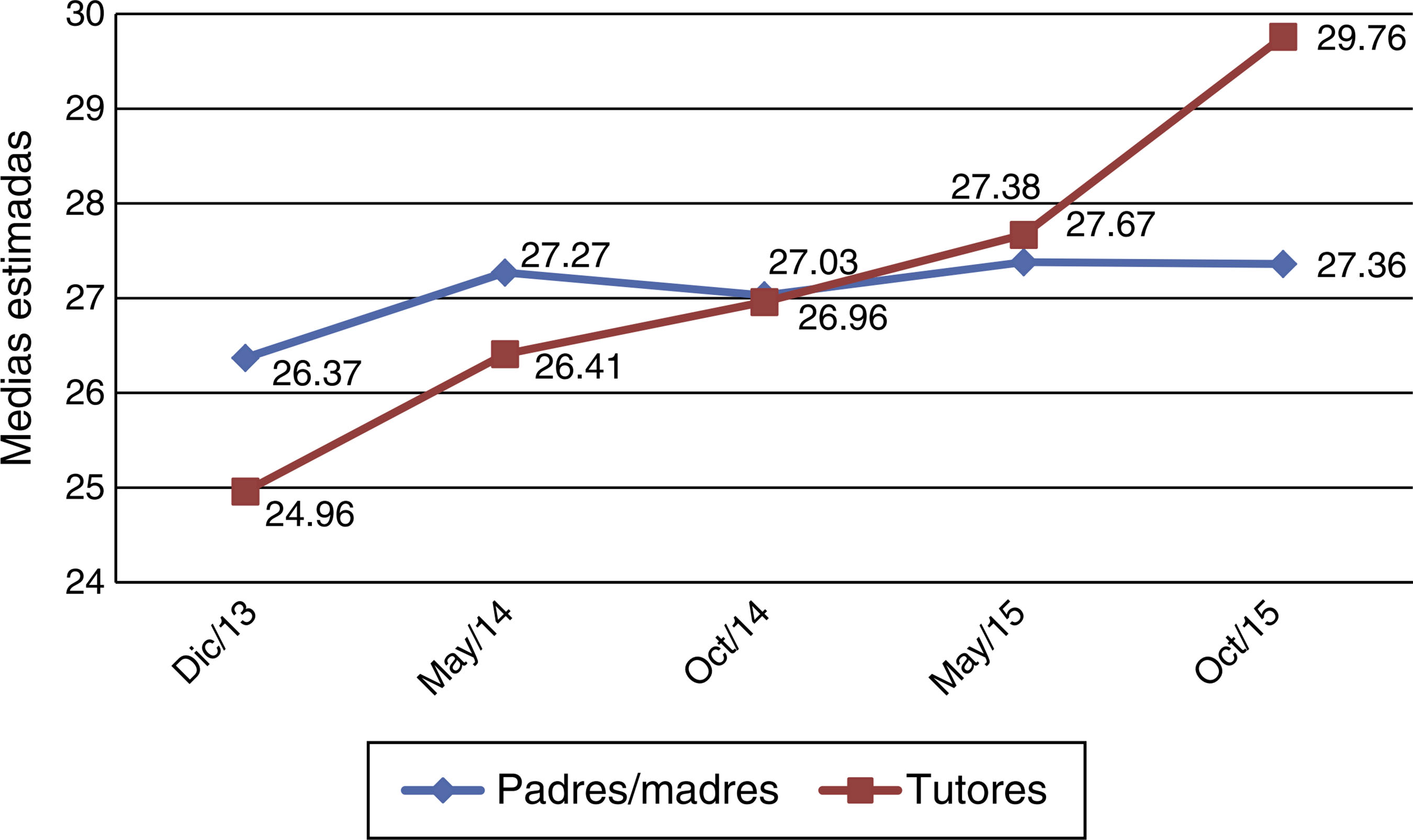 Este resultado indica que los padres percibieron una disminución de las conductas de inestabilidad emocional a lo largo de las evaluaciones. Sin embargo, la comparación por pares revela que las diferencias solo son significativas entre las puntuaciones de la valoración primera (dic/13, M = 29.35) y las valoraciones cuarta (may/15, M =26.88) (p = .02) y quinta (oct/15, M =26.5) (p = .004). En el mismo sentido, las diferencias son significativas cuando se comparan las puntuaciones obtenidas en la valoración segunda (may/14, M = 28.8) con las puntuaciones de las valoraciones cuarta (p =.044) y quinta (p = .05). Este resultado indica que los padres solo detectan mejorías en la labilidad cuando al menos ha pasado un año.