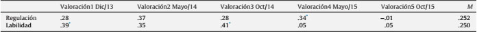Los análisis de correlación, mostrados en la tabla 3, indican que la asociación es baja entre las puntuaciones de los informantes en regulación emocional en todas las valoraciones, excepto en la valoración 4. Al contrario, hay más coincidencia entre los informantes en labilidad emocional. Como se muestra en la tabla 3, las tres primeras valoraciones están asociadas, pero no las dos últimas. Las correlaciones medias en las dos subescalas no superan el .25.