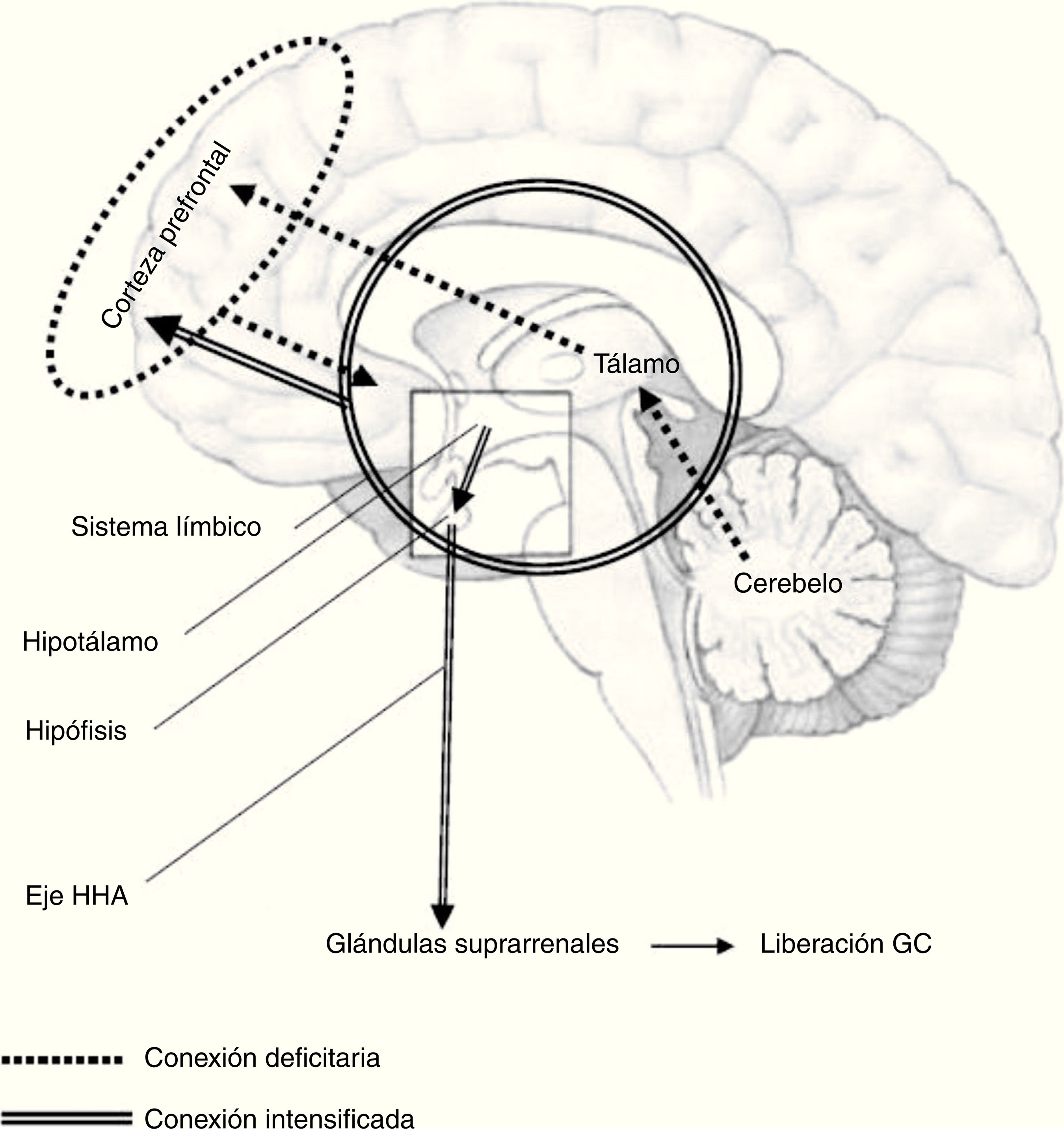 Amígdala. La principal alteración en esta región es una hiperreactividad amigdalina y la alteración de sus proyecciones. El mecanismo que opera parece ser la reducción de la densidad de los receptores centrales de benzodiacepinas y la intensificación de los del GABA-A, a consecuencia del elevado nivel de estrés en edades tempranas (Mesa-Gresa y Moya-Albiol, 2011). Paralelamente, el estrés correlaciona con un incremento de los niveles de dopamina y una disminución de la serotonina en el complejo de la amígdala extendida (núcleo central de la amígdala y núcleo accumbens), ocasionando hiperactivación del lóbulo temporal, denominada “irritabilidad límbica” (Mesa-Gresa y Moya-Albiol, 2011, p. 494; Molina-Díaz, 2015).