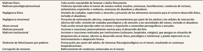 La Organización Mundial de la Salud (OMS, 2014) define el maltrato infantil como los abusos y la desatención de que son objeto los menores de dieciocho años. Incluye todos los tipos de maltrato físico o psicológico, abuso sexual, desatención, negligencia y explotación comercial o de otro tipo, que causen o puedan causar daño a la salud y desarrollo físico o mental, la dignidad del niño, o poner en peligro su supervivencia, en el contexto de una relación de responsabilidad, confianza o poder. Independientemente de los tipos de maltrato (tabla 1), a todos ellos subyace una situación disfuncional y patológica que afecta al desarrollo cerebral del menor y, por tanto, condiciona su desarrollo neurológico y su funcionamiento neuropsicológico (Mesa-Gresa y Moya-Albiol, 2011; Pérez y Capilla, 2008).