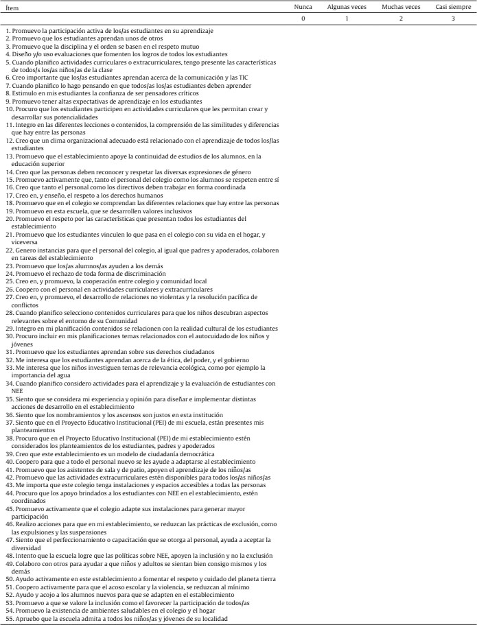 El instrumento que mide la auto-adscripción inclusiva es una adaptación del Índice de Inclusión de Booth y Ainscow (2011) que recoge la percepción de actitudes y conductas que la persona genera en relación a las tres dimensiones de la inclusión (culturas inclusivas, políticas inclusivas y prácticas inclusivas). Se proponen 63 ítems como parte del instrumento, con una escala de respuesta tipo Likert de cuatro alternativas, que comprenden nunca (0), algunas veces (1) muchas veces (2) y casi siempre (3). Luego de una aplicación piloto se configuró el instrumento preliminar usado para la muestra principal, que quedó con 55 ítems.