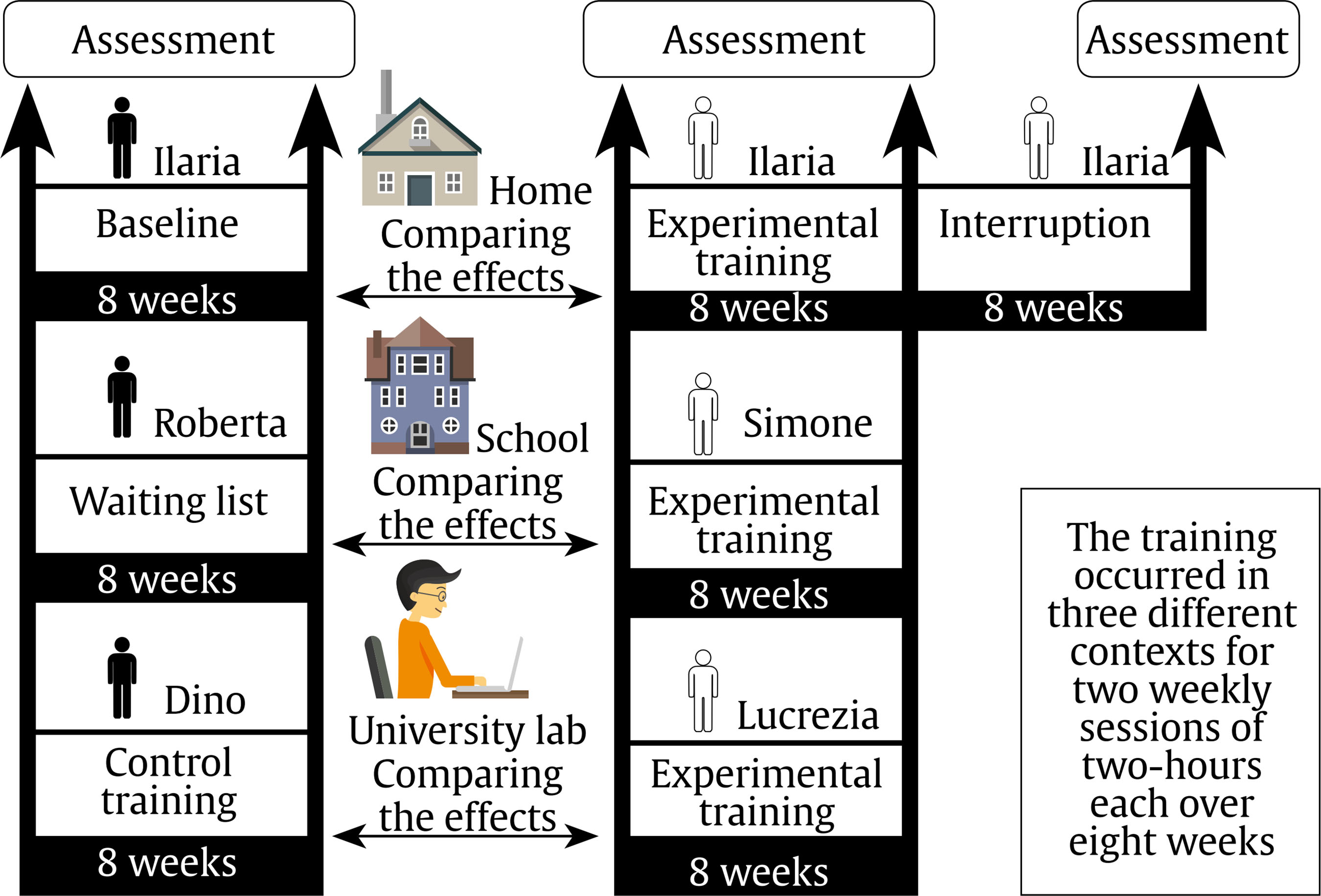 Studies exploring whether participants’ performance can improve after cognitive training have to rule out that increasing exposure to tests, or unspecific factors, such as increased motivation, are the crucial conditions generating changes. To understand whether participants’ improvements from pre- to post-training assessment could be interpreted as generated by the training itself, we choose three types of comparison, as shown in Figure 1. The first participant, Ilaria, was involved in a within-subject design by comparing the effects of a baseline condition with those of the experimental training, and then with those of a training interruption (see Figure 1). Each phase of baseline, training, and interruption consisted of eight weeks and was preceded and followed by testing.