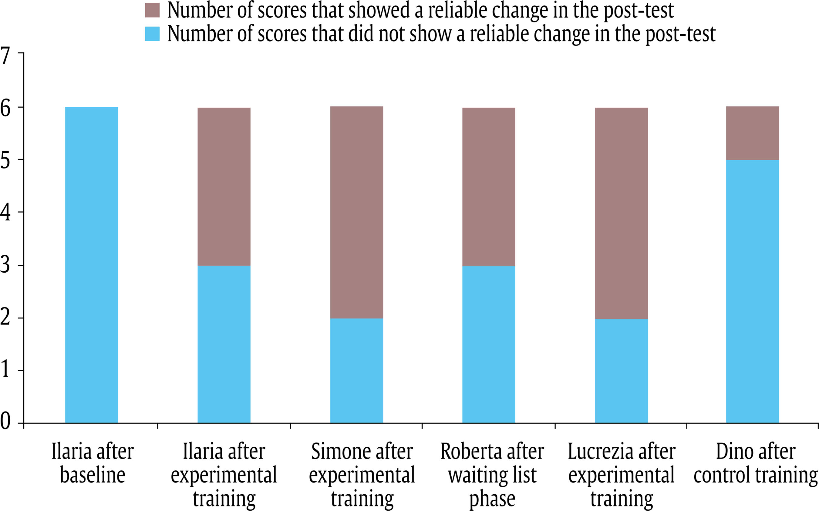 Focusing on problem-solving, out of two children who could show test familiarity effects (Ilaria after the baseline, Roberta after the waiting list period), only Roberta made a reliable change in performance with the Raven’s Matrices. Conversely, each of the three children involved with the experimental training made a reliable change in performance with the Raven’s Matrices (but only two of them had a post-test score within the normal limits). Concept formation, on the other hand, showed a reliable change in Simone and a clinically significant improvement in Dino, who was involved with the control training.