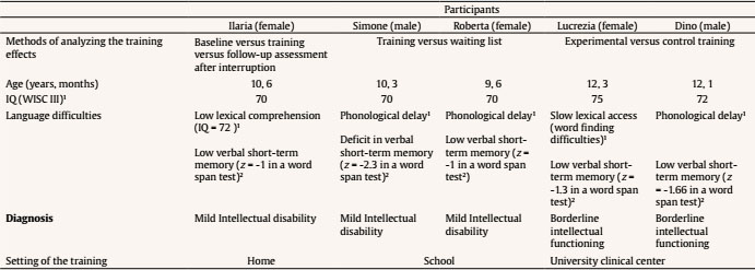 After approval from the Ethics Committee of the Department of Developmental and Social Psychology (Sapienza University of Rome), an informed consent was asked to the parents who accepted to have their children involved in this study. Participants were children whose mild intellectual disability (IQ between 55 and 70) or borderline intellectual functioning (IQ between 71 and 85) had been diagnosed by a certified clinical psychologist within public clinics in the area of Rome who tested them with the WISC-III (Wechsler, 1991) and assessed their adaptive functioning. The children had shown wide learning disabilities since their first grade class and were assisted by a special educator who, according to the Italian law, helps the children with special needs for a varying amount of time (accordingly to the severity of their impairment) within regular classes. Children were selected by either a psychologist within the public clinic in which the diagnosis had been issued or the child’s special educator. The following selection criteria were used: (a) the child had some type of language delay (see Table 1) and the psychologist or the child’s special educator judged that he/she could benefit from a training targeting verbal memory, (b) the child’s parents had communicated an intention to involve the child in a therapy and were deemed to be motivated to support their child’s engagement in the training, and (c) the psychologist or the child’s special educator judged the child to be motivated to participate at new learning experiences.