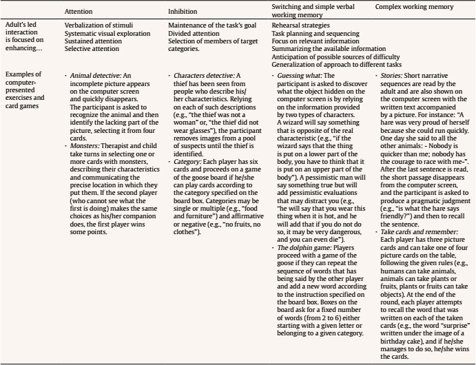 Key elements in our program included (1) specific activities stimulating attention, inhibition, switching, and verbal working memory; 2) guided practice emphasizing strategies to engage in exercises (e.g., verbalization to promote the task’s goal maintenance); 3) adapting the adult’s degree of support to the task difficulty and the child’s level of performance; and 4) sessions starting with an initial conversation and going on with one adult’s led exercise presented through PowerPoint and one card game (see examples in Table 2).