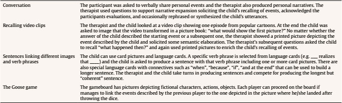 Similarly to the experimental training, each session started with conversation to promote a close adult-child relationship and build a practice of sharing personal memories. After such a warming stage, there were exercises with the software stimulating visuo-spatial working memory followed by structured narrative activities.
