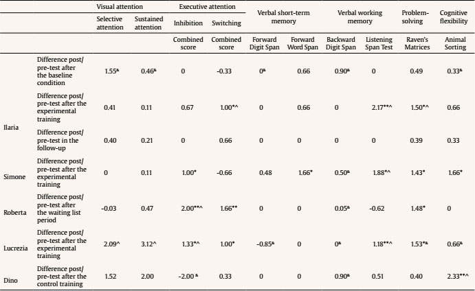 Table 4 shows the results on selective and sustained attention: out of the four children who could receive the effects of either experimental (Ilaria after the training, Simone, Lucrezia) or control training (Dino), only two (Lucrezia and Dino) showed a marked improvement. It is clear that the experimental training did not induce specific effects on attention, at least when such function is assessed through a visual search task.