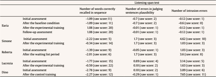 There were two types of evidence suggesting that the participants’ improvements involved working memory. First, the ability to recall more words in sequence in the listening span test did not occur at the cost of a less effective sentence processing. As shown in Table 5, in which raw and standard scores for performance in the listening span test are reported for each participant, there was no increase of errors in sentence judgements in the children who improved after the experimental training. An enhanced ability to control interference when recalling words was also observed (see a decrease of intrusion errors in Ilaria after the training, Simone, and Lucrezia). These findings suggest that after the experimental training children were more skilled in implementing the dual task of judging the semantic plausibility of the current sentence and keeping in memory the last word of the previous sentences.