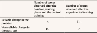Marked with “^” in Table 4 are the pre-/post-test scores that not only show a reliable change but also improved from being outside the normal limits in the pre-test to be within normal limits in the post-test. We will refer to such type of scores as “clinically significant change”.
