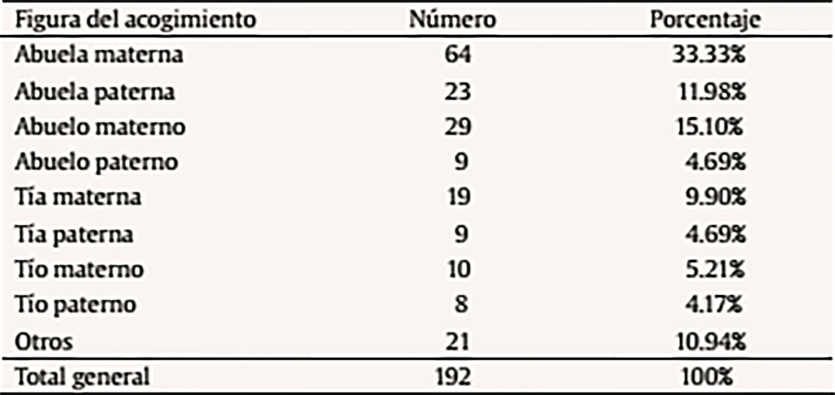 Las figuras mayoritarias en este tipo de acogimiento son los abuelos en un 66.67% de los casos. En los estudios realizados en otras zonas del país, este dato también es constante. En Barcelona en el año 2006 el 73.5% de los acogimientos estaban formalizados por los abuelos (Montserrat, 2006). En Valencia en el año 2007 el 70.3% se formalizaban con los abuelos (Molero et al., 2007), mientras que en Asturias es el 80% (Del Valle et al., 2002). Si comparamos los datos, podemos observar que Madrid es la ciudad en la que menos abuelos formalizan este tipo de acogimientos, a pesar de que sigue siendo así en la mayoría de los casos. Los datos en el ámbito internacional son similares. Por ejemplo, en Reino Unido el 71% de los acogimientos se formalizan con los abuelos (Wellard et al., 2017).