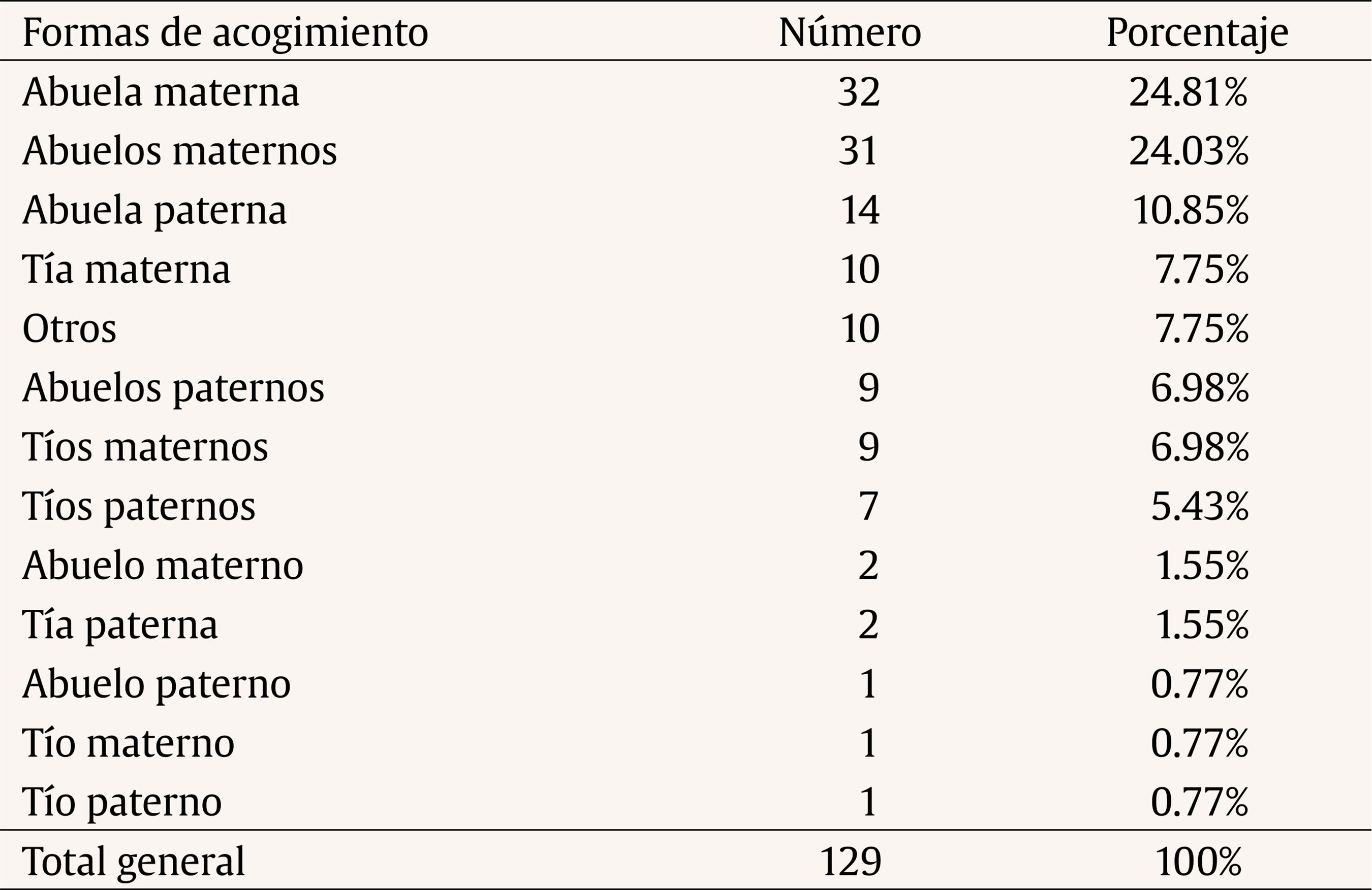 La Tabla 1 recoge el número de acogedores y el parentesco que los une con los acogidos. Así, se observa que la figura más habitual dentro del acogimiento en familia extensa son las abuelas maternas con un 33.33%, lo que representa un tercio de los acogedores. Otro dato significativo que se obtiene de esta tabla es la relevancia de la familia materna como principal cuidadora de los menores, ya que suponen el 63.54% de los acogedores. Junto a ello, es destacable la relevancia de la presencia femenina, pues el 60% de los acogedores son mujeres, sin tener en cuenta la categoría de “otros”, donde se incluyen diferentes familiares como los tíos/as abuelas/os, primos y hermanos.