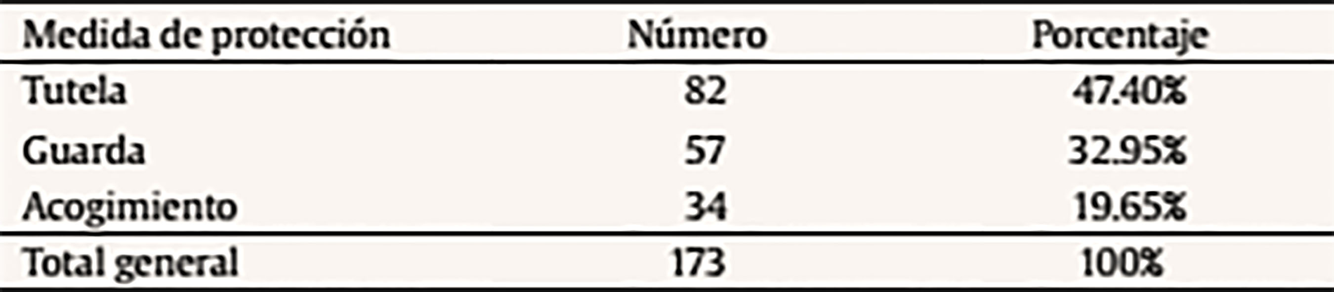 Regarding the protection measure, 47.40% are “guardians”, which means that situations lived by children with their parents before the separation have usually been very complicated. Moreover, almost 70% of kinship foster care is administrative, which implies that parents have accepted such measures, and 87.28% is permanent, so a family reunification is not probable, at least in the short term.