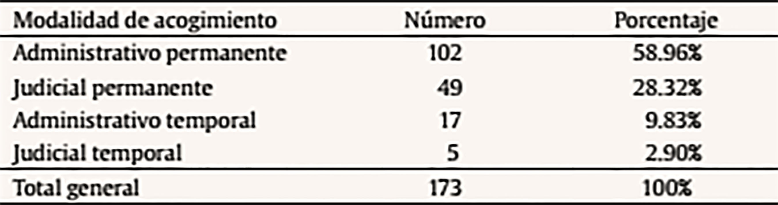 Otro dato a destacar del perfil de este tipo de acogimiento es su modalidad, que se concreta en la Tabla 4, en la que como se observa casi el 70% de los acogimientos son administrativos, lo que significa que en la mayor parte de los casos existe el consentimiento de los padres para que se formalice el acogimiento, aunque también es importante destacar que el 87.28% de los acogimientos en extensa se formalizan como permanentes, lo que supone que no se prevé un retorno con sus progenitores en un plazo de tiempo de aproximadamente dos años. En contraste, un tercio de los acogimientos requieren la intervención judicial para su resolución, lo que implica que los padres no consienten el acogimiento.