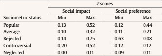 Peer acceptance. The sum of the positive and negative nominations (using absolute values) was taken as a measure of social impact for each adolescent, while the difference between the number of positive and negative nominations served as an indicator of social preference. These indicators (social impact and social preference) were then standardized to Z scores and combined in order to define the sociometric status of each participant (Coie et al., 1982): popular (positive social preference and high social impact), controversial (neutral social preference and high social impact), average (average positive preference and social impact), rejected (negative social preference and high social impact), and neglected (low social preference and low social impact). Table 1 shows the interval of scores used to classify the sample.