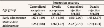 Regarding age, we found significant differences between the two groups (early vs. middle-late adolescents) in the accuracy of their generalized perceptions of acceptance, Mann-Whitney U = 4382.00, z = -2.01, p = .026, r = .14. However, no significant differences were observed in the accuracy of dyadic perceptions of acceptance, or in the accuracy of either generalized or dyadic perceptions of rejection. With respect to bias, we found no differences in the perception of acceptance, c2(2) = 1.16, p = .559, or of rejection, c2(2) = 3.27, p = .194. The mean scores and standard deviations for perception accuracy in the two age groups are shown in Table 2.