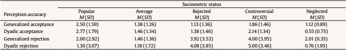 Finally, we examined differences in bias and in the generalized and dyadic accuracy of perceptions of acceptance and rejection according to sociometric status. Research regarding accuracy and bias in children younger than thirteen pointed out that accepted children are conscious about their status as well rejected children are, but tend to underestimate their acceptance and rejection, respectively (Boor-Klip et al., 2014; García-Bacete, Marande-Perrin, Schneider, & Cillessen, 2019; Morrow et al., 2015). Here, we expected to find (1) that dyadic perceptions of acceptance and rejection would be more accurate than generalized perceptions, (2) that popular adolescents would be more accurate in their perceptions of acceptance because of their cognitive development, and (3) that rejected adolescents would be more accurate in their perceptions of rejection. Nevertheless, the results do not support these hypotheses.