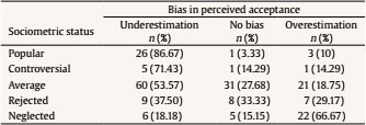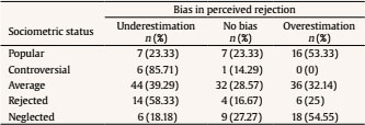 Regarding bias, sociometric status was associated with significant differences in the perception of both acceptance, c2(8) = 50.875, p < .001, and rejection, c2(8) = 22.885, p = .004. Tables 4 and 5 show the frequency and percentage of bias in perceived acceptance and rejection according to sociometric status. As it can be seen, 86.67% of popular and 71.43% of controversial children tended to underestimate their acceptance whereas 66.67% of neglected ones overestimated their positive nominations. Besides, 58.33% of rejected and 85.71% of controversial children underestimated their rejection and 54.55% of neglected peers overestimated the negative nominations they had been received.