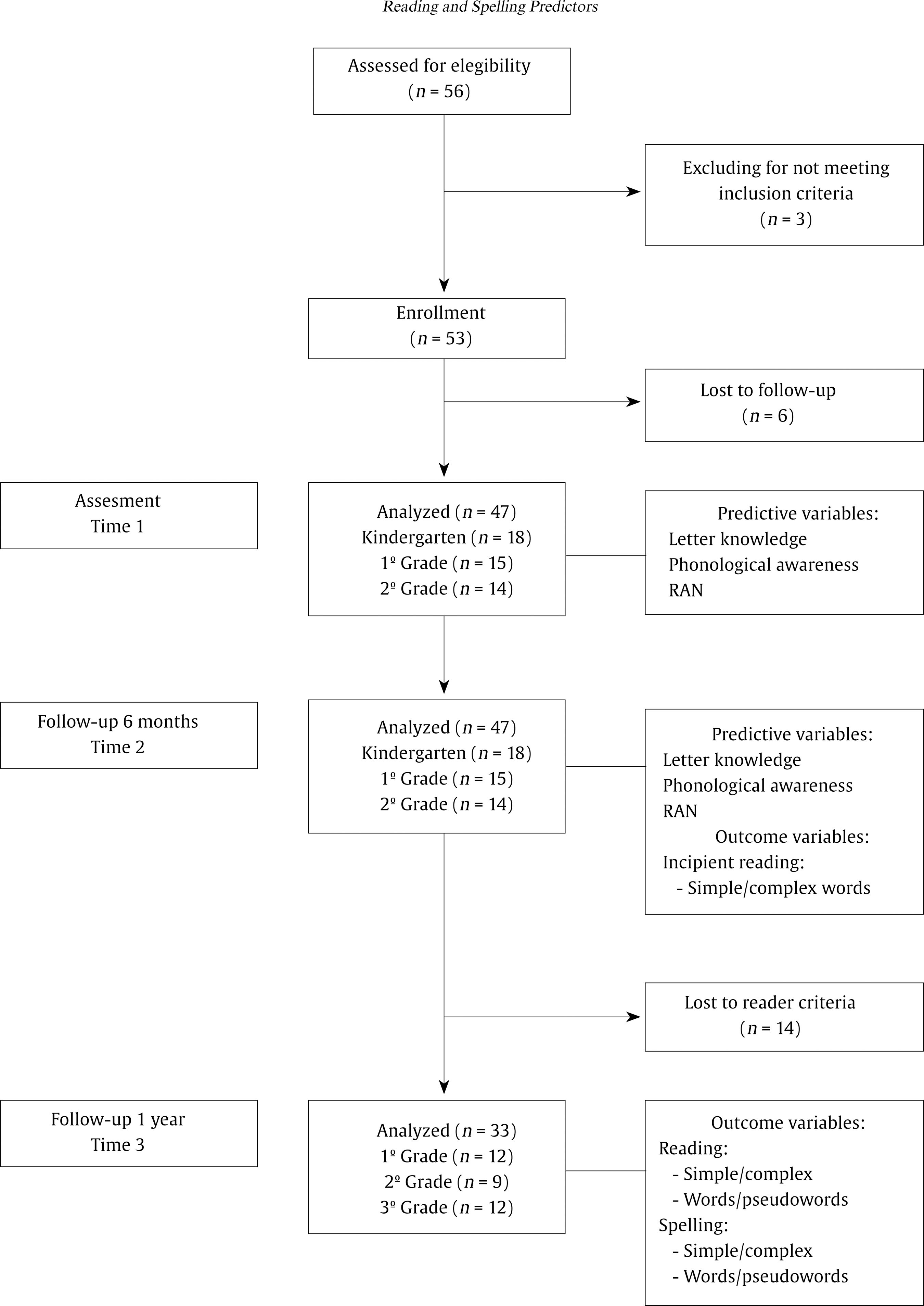 The study included three assessment times, carried out during 15 months, from October 2014 to December 2015. In Time 1, all the participants were assessed at the beginning of the school year (October to December); in Time 2, at the end of the school year (May to June); and in Time 3, at the beginning of the next school year (October to December). Prediction measures were taken in Times 1 and 2 and the reading and spelling measures in Time 3. The order of administration of prediction measures was the following: rapid naming, phonological awareness, and letter knowledge. Reading and spelling tasks were counter-balanced and the order of stimuli type was the following: simple words, complex words, simple pseudowords, complex pseudowords, PROLEC-R words, and PROLEC-R pseudowords. To avoid memory effects from the reading task to the spelling task (or vice versa), the two tasks were carried out on different days, with an interval of three or four days. All the children were evaluated individually by the two authors and another evaluator who received training in the administration of tasks. The evaluation was carried out in a quiet room in the school.