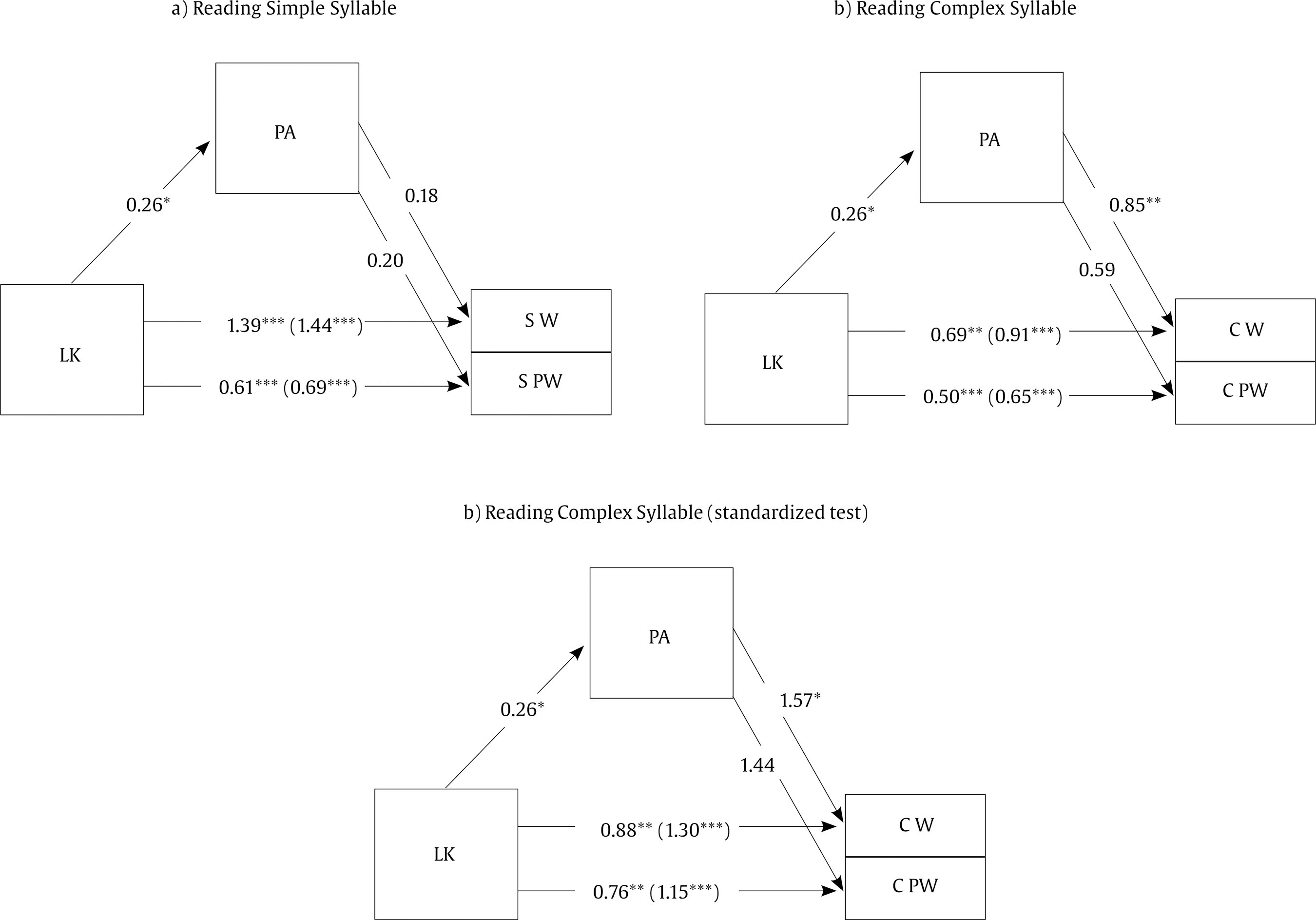 In addition, in all cases, the results indicated that the direct effect of letter knowledge continued to be significant when controlling for phonological awareness.