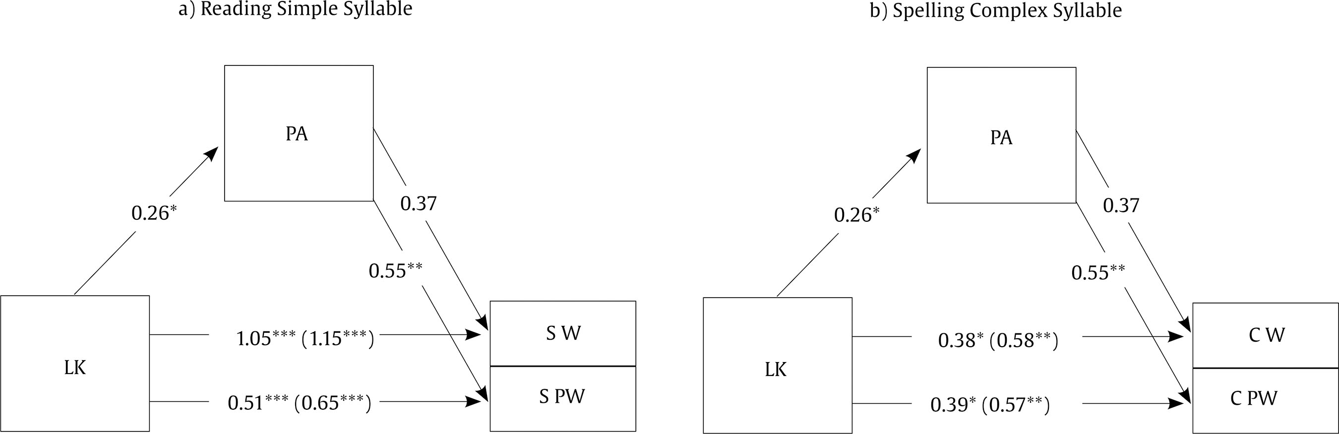 First, letter knowledge was the strongest predictor of reading-spelling words and pseudowords with a simple structure, and phonological awareness did not mediate in this relationship.