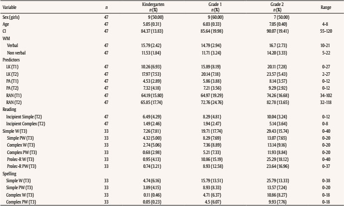 Demographic and cognitive characteristics of the participants by grade are presented in Table 1. Mean IQ scores, as estimated from their performance on the Peabody Picture Vocabulary Test-Third Edition (Dunn & Dunn, 1997), were situated approximately one standard deviation below the mean, according to normative data for the test in all the grades. Mean scores for working memory, estimated from their performance on the Stanford-Binet Intelligence ScalesFifth Edition (Roid, 2003), were near the mean, based on normative data for the test in all the grades. To consider children readers, the criterion was established of having read at least three words correctly. At the beginning of the study, 79% (18 kindergartens, 13 first graders, and 6 second graders) were prereaders considering the mentioned criteria, that is, they were not able to correctly read three or more words with a simple structure and three or more words with a complex structure. Specifically, in Time 1, none of the kindergarten children were able to read simple or complex words; 40% of first graders were readers of simple words, but only 13% could read complex words; and 71% of second graders were readers of simple words, whereas 57% could read complex words. In all, 33 children were readers at the end of the study one year later (12 kindergartens, 9 first graders, and 12 second graders).