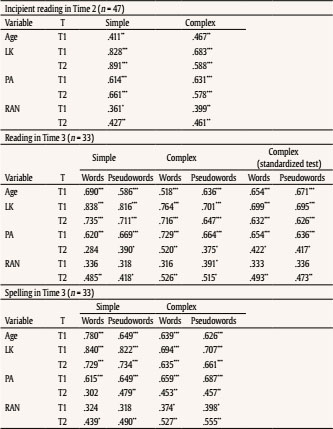 Table 3 shows regression analyses for predictive variables taken in Time 1 to explain results in incipient reading in Time 2 and literacy one year later, in Time 3.