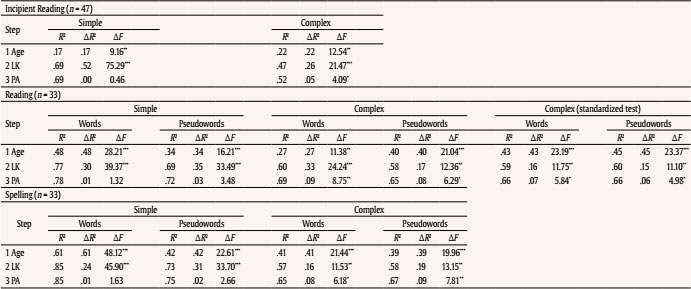 Hierarchical multiple regression analyses were carried out to examine the specific and unique contribution of predictors in the variations in performance on reading and spelling words and pseudowords with simple and complex structures 6 and 12 months later. Independent variables, in order, were: age, letter knowledge, and phonological awareness. RAN was excluded from these analyses because of the non-significant contribution to the variance in reading and spelling performance in Time 3 in any type of stimulus. Predictive variables measured in Time 1 and Time 2 were taken to explain results in incipient reading in Time 2 and literacy in Time 3. Variables were introduced in separate stages with each independent variable. The order in which predictors were introduced into the regression equation was determined by correlation coefficients obtained and previous literature. Variance inflation values were all lower than 10, and condition indices were lower than 30. Regression analyses for the final model are described.