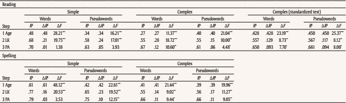 Spelling. Performance on spelling words with a simple structure was predicted by age ( = .59, p = .000) and letter knowledge ( = .39, p = .001). Phonological awareness ( = .17, p = .070) was not significant. Together, these variables contributed to approximately 79% of variance. Performance on spelling pseudowords with a simple structure was predicted by age ( = .44, p = .000), letter knowledge ( = .41, p = .001), and phonological awareness ( = .34, p = .002). Together, these variables contributed to approximately 75% of variance.