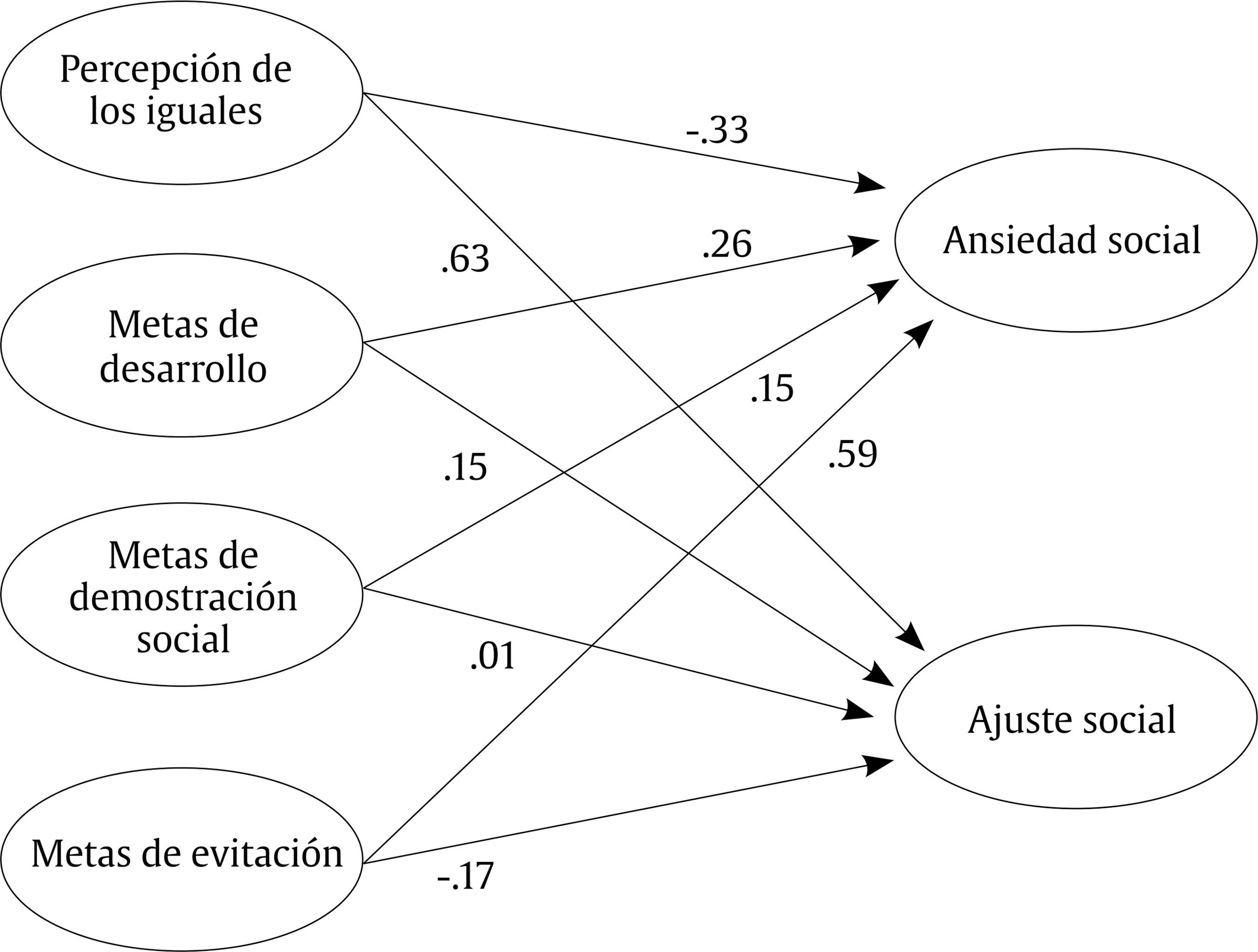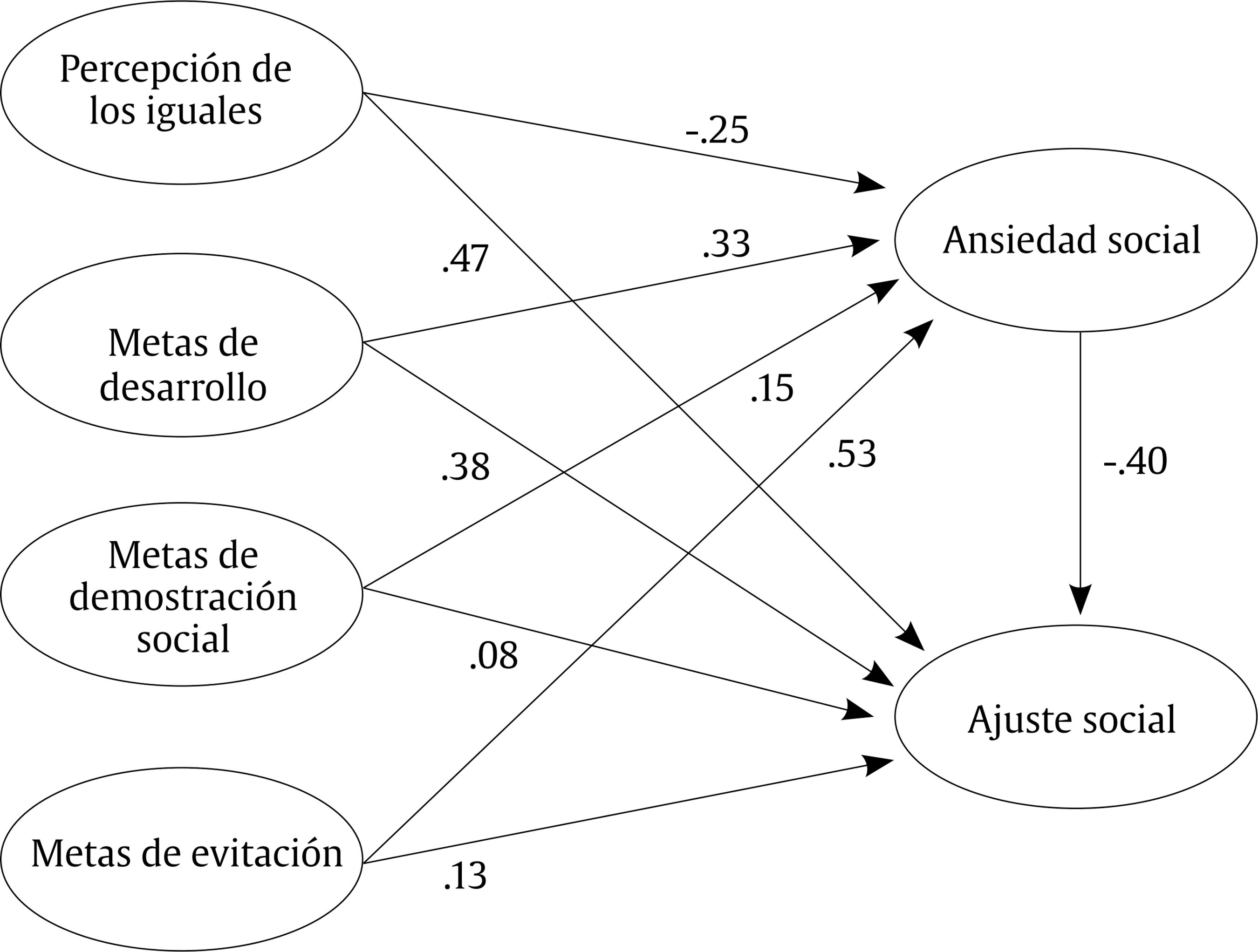 El modelo mostró buenos índices de ajuste: S-B 2 = 7514.5645, p < .001, NNFI = .951, CFI = .953, RMSEA = .047 [IC: .045-.049]. Se observó que la percepción de los iguales tuvo una relación directa con el ajuste social ( = .47, p < .05) e inversa con la ansiedad social ( = -.25, p < .05). Las metas de desarrollo se relacionaron directamente con el ajuste social ( = .38, p < .05) y también con la ansiedad social ( = .33, p < .05), mientras que las de demostración social mostraron una relación directa con el ajuste ( = .15, p < .05) y con la ansiedad ( = .08, p < .05). Las metas de evitación se relacionaron de forma directa con la ansiedad ( = .54, p < .05) y con el ajuste ( = .13, p < .05). Finalmente, la ansiedad social se encontró relacionada directamente con el ajuste social ( = -.40, p < .05). Estas relaciones representaron el 47% de la varianza total de la ansiedad social y el 47% de la varianza del ajuste social.