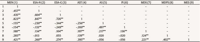 Escala de ansiedad social para adolescentes (Social Anxiety Scale for Adolescents - SAS-A; La Greca y Lopez, 1998) validada en población adolescente española por Olivares et al. (2005). Esta escala se compone de 18 ítems que se responden a través de una escala tipo Likert de 1 a 5 para indicar la frecuencia con que suceden esos pensamientos o conductas (1 = en absoluto, 5 = siempre). La escala evalúa tres dimensiones de la ansiedad social: miedo a la evaluación negativa (MEN), que consta de 8 ítems (p. ej., Me preocupa no gustarle a otras personas), evitación social y angustia (nuevo) (ESA-N), con 6 ítems (p. ej., Me siento tímido alrededor de gente que no conozco) y evitación social y angustia general (ESA-G), que consta de 4 ítems (p. ej., Es difícil para mí pedir a otras personas que hagan algo conmigo). La escala en el presente estudio mostró buena consistencia interna ( = .90), al igual que las diferentes subescalas que la componen (MEN = .87, ESA-N = .85 y ESA-G = .79).