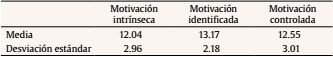Una ANOVA de Friedman muestra diferencias significativas intrasujeto entre los diferentes tipos de motivación, X2(2) = 11.003, p = .004. Se realizaron comparaciones post hoc con la prueba de los rangos con signo de Wilcoxon, con corrección de Bonferroni a nivel de significación de p < .017. Las comparaciones muestran que la motivación identificada es significativamente superior a la motivación intrínseca (Z = -4.345, p < .001), no llegando el resto de comparaciones al nivel de significación (identificada-controlada, Z = -1.865, p > .017; intrínseca-controlada, Z = -1.883, p >.017).