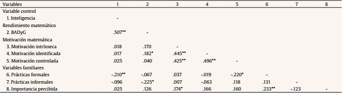 Correlaciones entre tipo de motivación, variables familiares y rendimiento en matemáticas. Se realizaron correlaciones de Spearman entre las diferentes variables del estudio (Tabla 2).