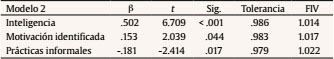 En la Tabla 4 puede observarse la importancia de cada variable en el segundo modelo, así como los estadísticos de colinealidad. Puede observarse que todas las variables incluidas en el modelo realizan contribuciones significativas a la predicción del rendimiento matemático y que los estadísticos de colinealidad son adecuados.