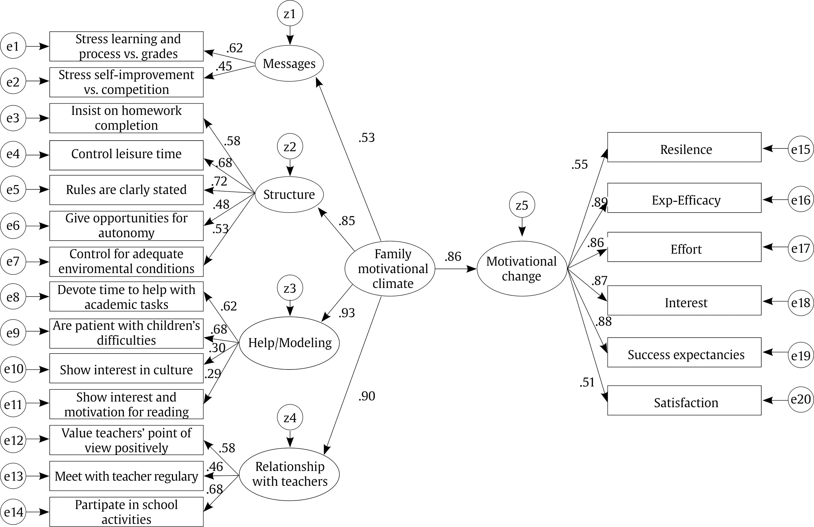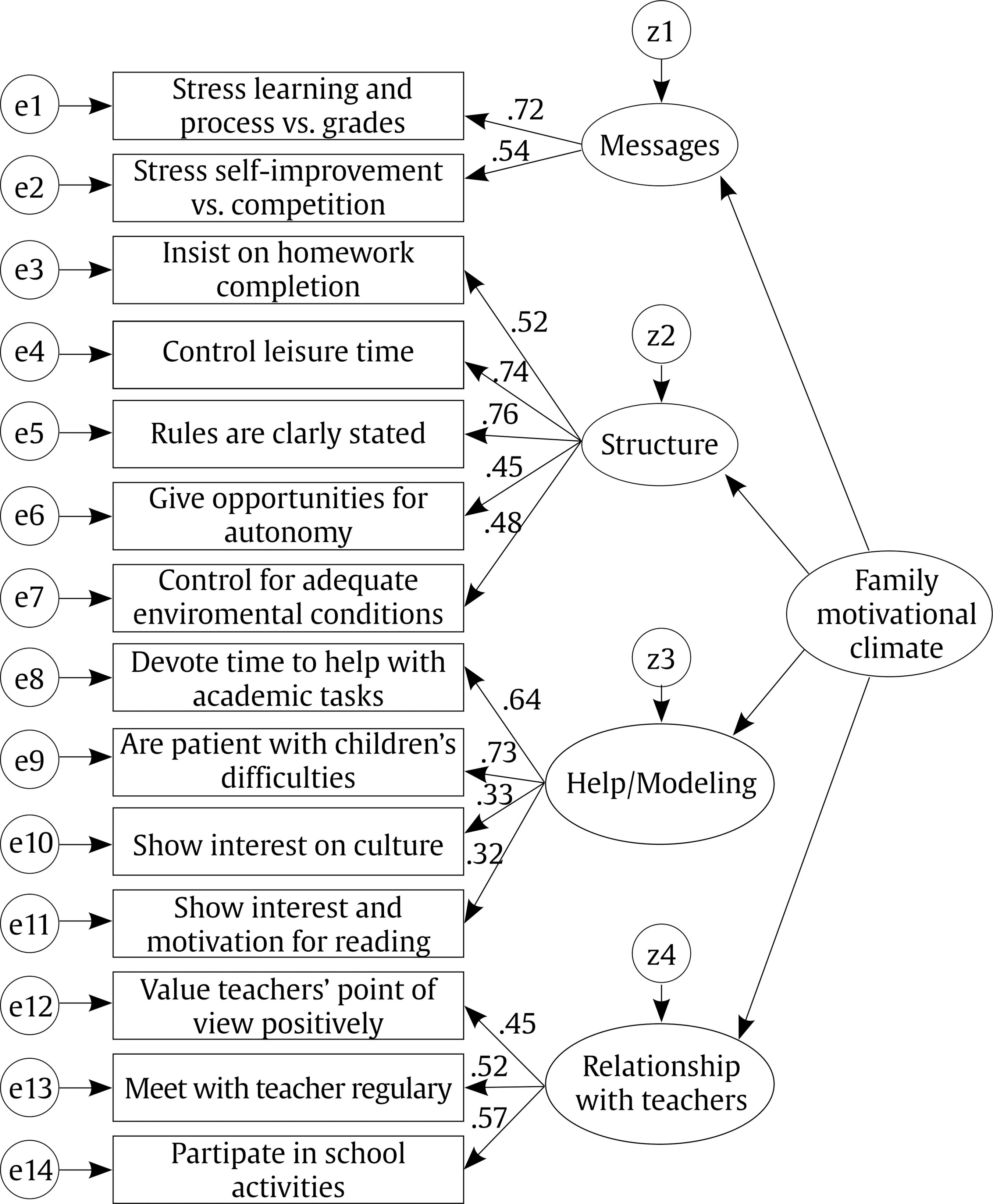 First, the results supported the structural validity of the theoretical model underlying the FMC-Q in both cultures. The four dimensions assessed by the FMC-Q significantly contributed to the good fit of the model. Messages conveyed by parents to their children define communication styles that promote a learning-oriented FMC, as long as these messages encourage self-improvement over competition and emphasize the learning process rather than the grades obtained. Likewise, daily family routines can contribute to the emergence of a learning-oriented FMC by: a) providing adolescents with opportunities to learn in an autonomous way during their leisure time and structure for their study at home, b) instilling in children, from the example set by parents, interest in learning new things, reading, and enjoying culture in general and, c) valuing and trusting the education that teachers and school offer to students. The importance of the parental behavioral patterns just mentioned, included in the FMC-Q, had been pointed out in different studies of parental involvement (Cheung & Pomerantz, 2012; Finley & Schwartz, 2004; Pomerantz et al., 2005, 2007). Therefore, the FMC-Q seems to be a good way of assessing all of them in an integrated way, as they do not act in an isolated way.