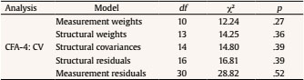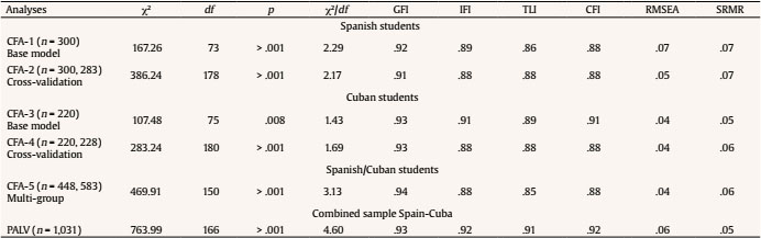 Crossed validation: multi-group analysis with Cuban subsample (CFA-4). A multigroup analysis with the two Cuban subsamples (Table 2, CFA-4) was carried out to validate the initial results. The results showed a good fit across several indicators (i.e., χ2/df, GFI, RMSEA, and SRMR), whereas in others (i.e., IFI, TLI, CFI) fit indexes fell slightly below standard levels of significance. Nonetheless, the comparison between groups showed that adjustment did not decrease even if equality constraints were imposed on the measurement weights, structural weights, the structural covariances, structural residuals, and measurement residuals (Table 4, CFA-4). Therefore, it was concluded that the model was well estimated.