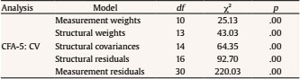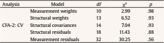 Crossed validation: Multi-group analysis with the Spanish subsamples (CFA-2). Fit indices fell within the confidence limits (Table 2, CFA-2), and the model parameters shown in Table 3 revealed that model fit did not decrease significantly even if restrictions were imposed in measurement weights, structural weights, structural covariances, structural residuals, and measurement residuals.