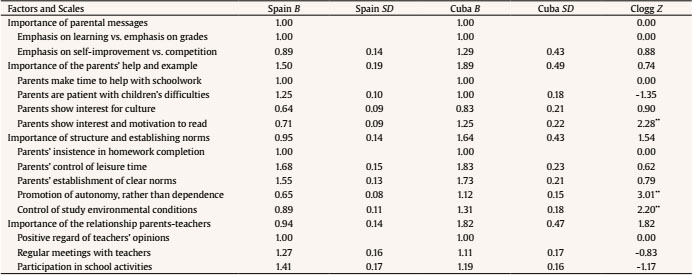 The results of the comparison between the Spanish and Cuban students, carried out using multi-group confirmatory factor analysis, is presented in Table 2 (CFA-5 MG). As can be seen, χ2/df, GFI, RMSEA and SRMR showed a good fit, although the rest of the indices (i.e., IFI, TLI, IFC) were slightly below the standard significance levels. In this case, the comparison between groups showed that the adjustment changed if equality constraints were imposed on the different parameters (Table 5, CFA-4). Therefore, the significance of the differences between parameters was evaluated using the Clogg et al.’s (1995) Z test to determine the factors in which there were significant differences between the two groups. The results of this analysis (Table 6) showed that there were significant differences between three variables: the autonomy parents give to their children in performing school activities (Z = 3.01), parents’ interest in reading (Z = 2.28), and parents’ control of the environmental conditions where children study (Z = 2.20). In all cases where significant differences were obtained, the weights were higher in the Cuban sample.