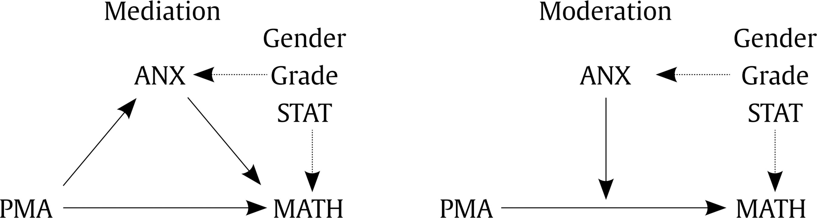Therefore, in the current study, in addition to direct effects, we analyze the mediator role (indirect effect) or moderator role (conditional effect) of ANX in the effect of PMA on MATH. In these analyses the effect of real competence (intellectual abilities), gender, and school year will be statistically controlled for, due to their confirmed part in explaining the differences in MATH. Figure 1 represents the mediation and moderation models to be examined.