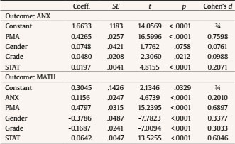 Table 2 gives the data from the mediation analysis. The regression model explains a significant amount of the variance, both in ANX, R2 = .3824, R2adjusted = .139, F(4, 2180) = 93.3240, p < .0001, and especially in MATH, R = .5023, R2adjusted = .251, F(5, 2179) = 147.0921, p < .0001).