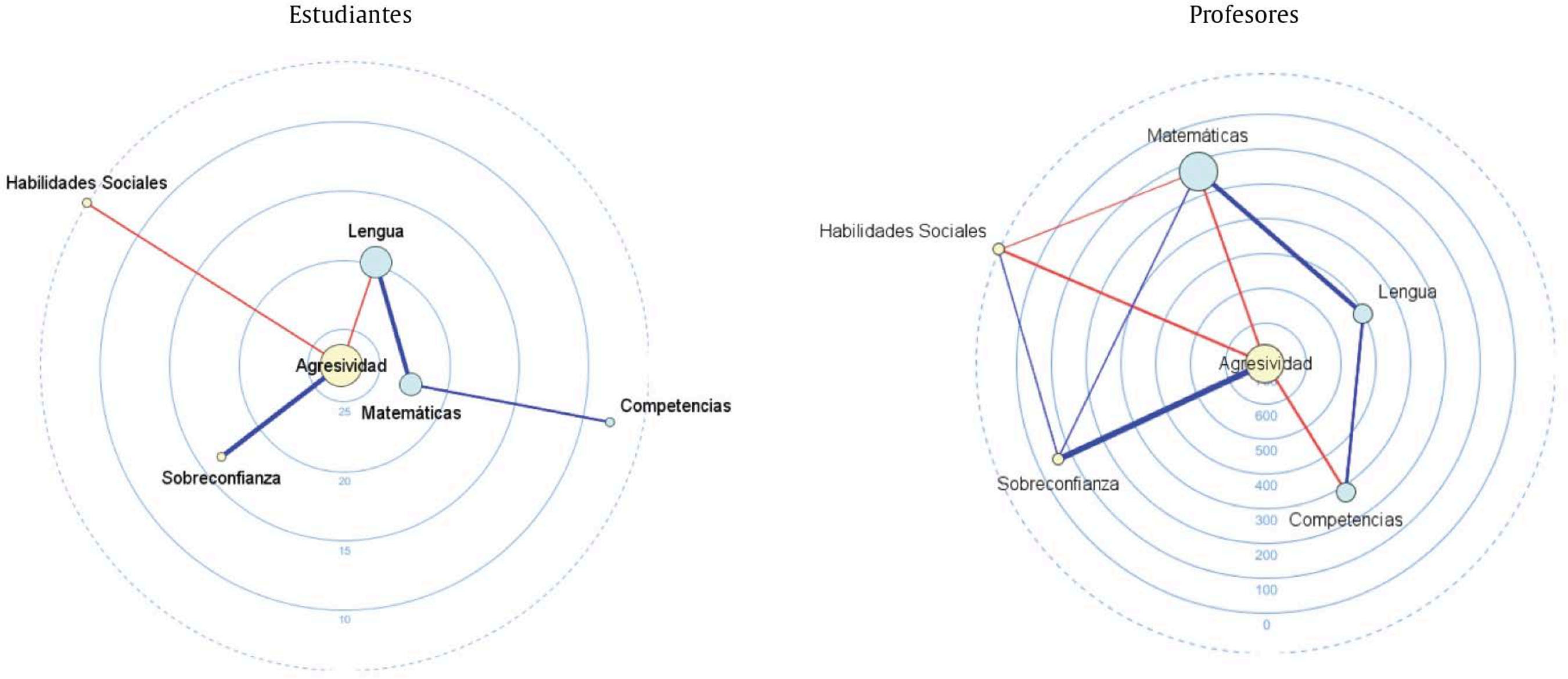 Análisis de correlaciones parciales y visualización de redes. A partir de la tabla de correlaciones parciales, representamos la red de asociaciones significativas entre los factores evaluados, comparando el caso de los estudiantes con el de los profesores (Tabla 3, Figura 1). Esto permite poner en perspectiva la estructura interna de la evaluación socioacadémica en ambos grupos. Tanto para los estudiantes como para los profesores la agresividad es el factor con mayor centralidad, mejor conectado con el resto de los elementos. Además, los tres factores relativos a las habilidades sociales presentan una estructura bastante similar, con una asociación positiva alta de la agresividad con el exceso de confianza (r = .704, p < .01, d = 1.983 en los estudiantes y r = .853, p < .01, d = 3.269 en los profesores) y una relación negativa de baja intensidad de la agresividad con la existencia de habilidades sociales apropiadas (r = -.240, p < .01, d = -0.495 en los estudiantes y r = -.333, p < .01, d = 0.706 en los profesores).