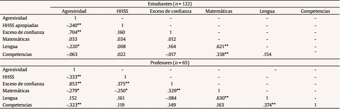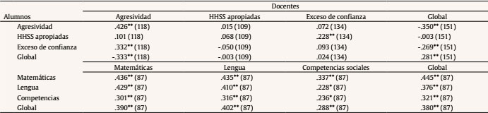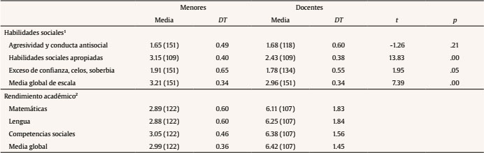 Correlations between minors and teachers. Self-assessment of social skills carried out by children is significantly above the assessment of their teachers (t = 7.39, p < .001), especially in appropriate social skills (t = 13.83, p < .001). However, children self-attribute a greater overconfidence than their teachers do. In the bivariate correlations, a greater consistency in the academic data is clearly observed.