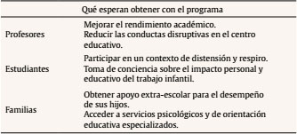 Para los profesores, un programa de este tipo es una oportunidad para mejorar el comportamiento de sus estudiantes. Consideran fundamental que los alumnos se adapten adecuadamente a las actividades escolares y que sean capaces de establecer relaciones de amistad y empatía hacia los iguales. Después de participar en un programa psicoeducativo esperan que rindan en las tareas académicas y mejoren su comunicación oral y escrita. También consideran prioritario que disminuyan las conductas disruptivas o agresivas.