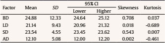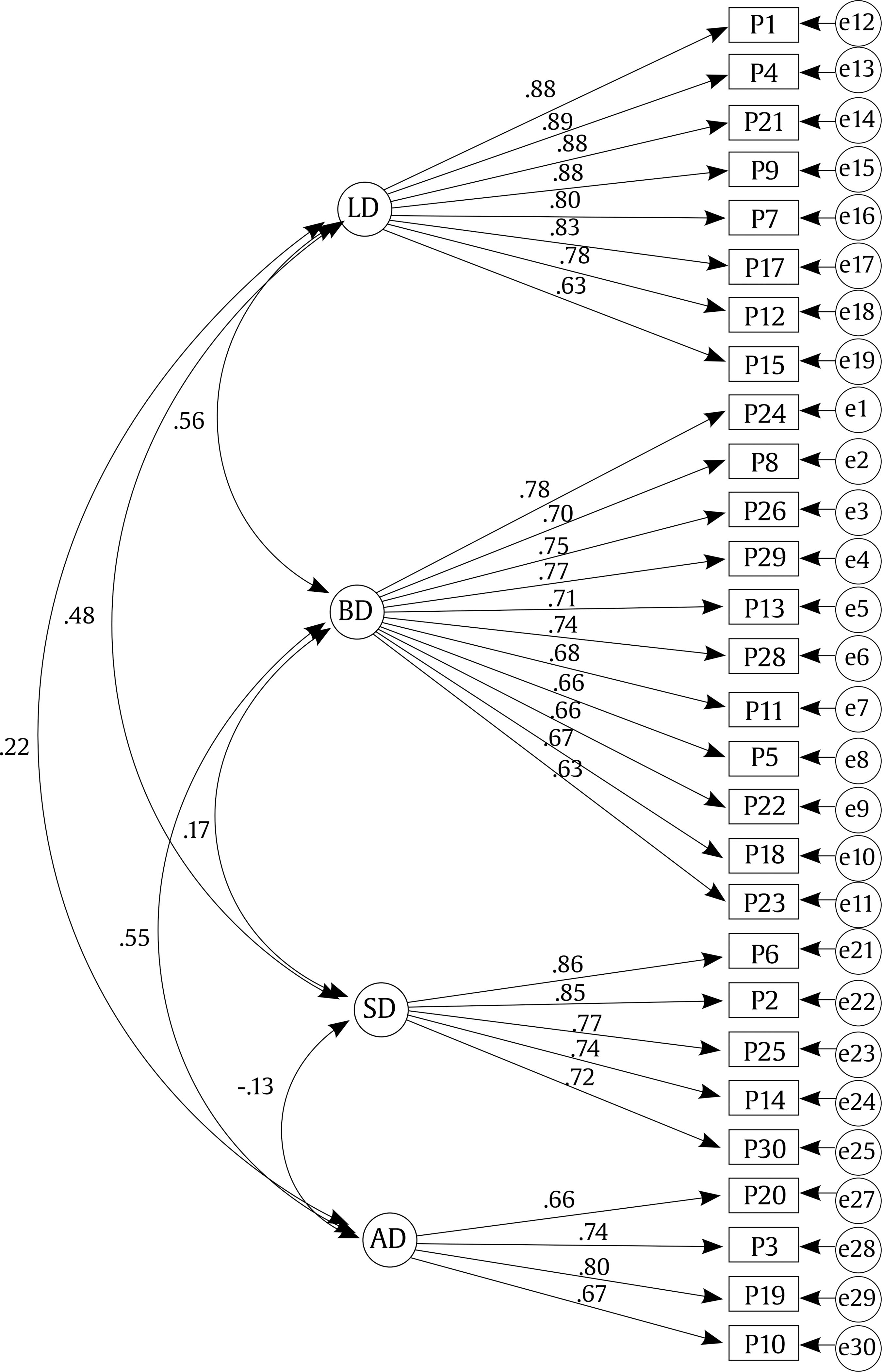 All dimensions displayed high reliability. For the total scale (28 items), Cronbachs alpha reached .914 for BD, .948 for LD, .892 for SD, and .813 for AD. The AVE was .50 for BD, .68 for LD, .62 for SD, and .52 for AD. All values were greater than or equal to .50, which indicates that the construct explains more than half of the variance of all the indicators that compose it (Hair et al., 2009). Regarding the CR, .71 was obtained for BD, .81 for LD, .78 for SD, and .73 for AD. The values obtained indicate good levels of composite reliability, since all of them are greater than .70 (Hair et al., 2009).
