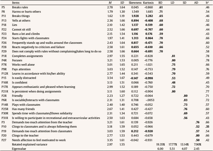 In the first factor, items 24 (starts fights with classmates) and 8 (harms or hurts others) display the highest factor loadings, while the rest of the items refer to aggressive, oppositional, and hyperactive behaviors; therefore, the factor was labeled Behavioral Difficulties (BD). In the second factor, inverted items 1 (completes assignments) and 4 (focuses) have the highest factor loadings, while the rest refer to behaviors involving poor performance in school tasks and a lack of attention in class, the factor was labeled Learning Difficulties (LD). In the third factor, inverted items 6 (is sociable/interacts with classmates) and 2 (friendly) display the highest factor loadings, while the rest of the items describe students level of sociability in school; therefore, the factor was labeled Social Difficulties (SD). In the fourth factor, the items with the highest loadings are 20 (clings to the teacher) and 3 (demands too much attention from the teacher), while the rest refer to the need for social attention and the desire to bond with others. Considering the above, the factor was entitled Autonomy Difficulties (AD).