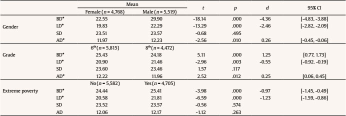Descriptive data are shown in Table 4. Differences in the scores of the factors according to sociodemographic characteristics were established using the Student t-test, given the normality of the variables tested through the Kolmogorov-Smirnov test. It was found that the score of behavior, learning, and autonomy difficulties has a significant difference between gender and grade. At the same time, poverty only accounts for differences regarding behavioral and learning difficulties (see Table 5)