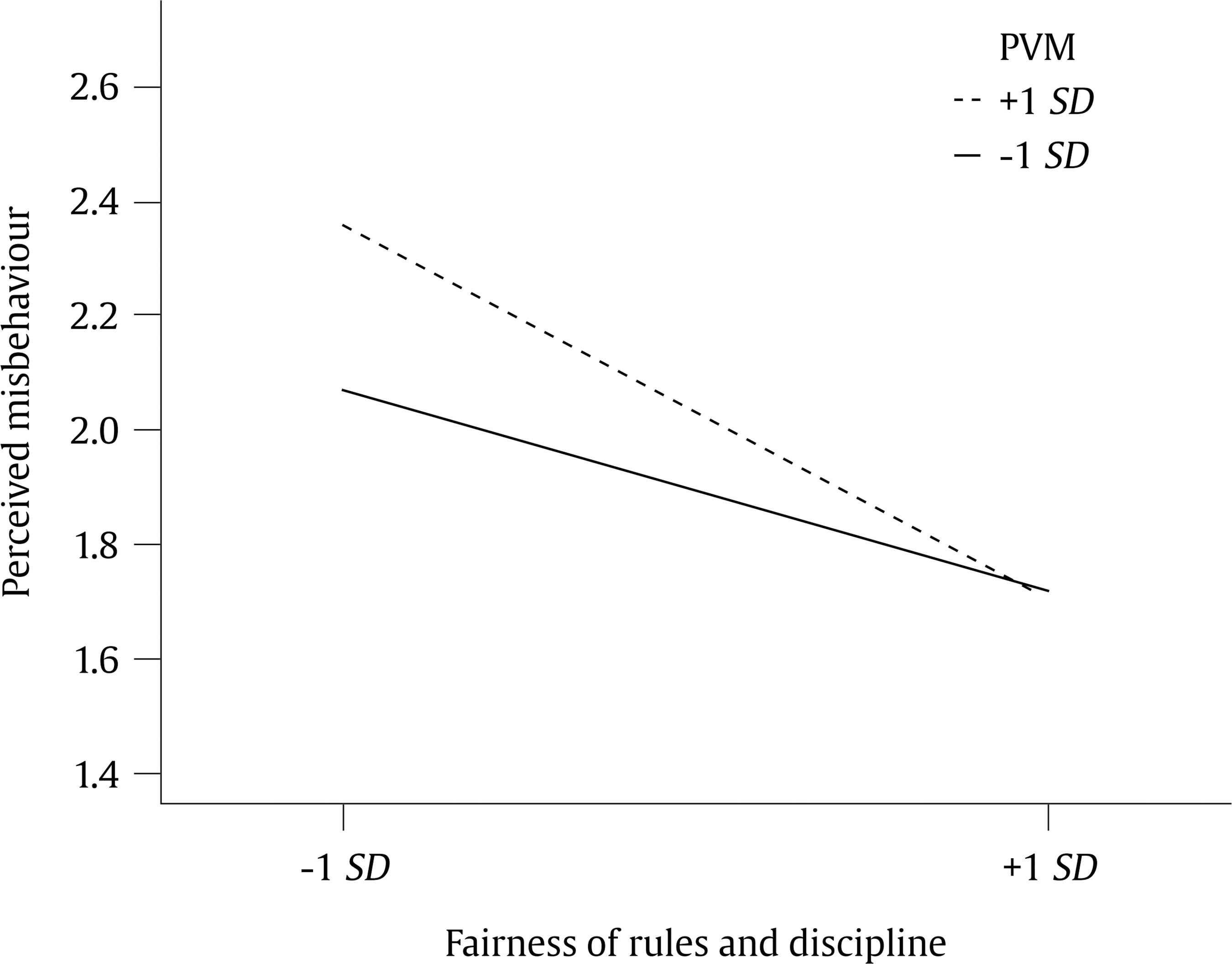 Finally, a potential moderating effect is expected from other contextual variables (coercive treatment from teachers and pro-violence family messages) in terms of relationships between perceived misbehaviour and school climate variables (family support for teachers, leadership from schools principals, quality of rules and discipline), though specific hypotheses are not proposed in this regard.