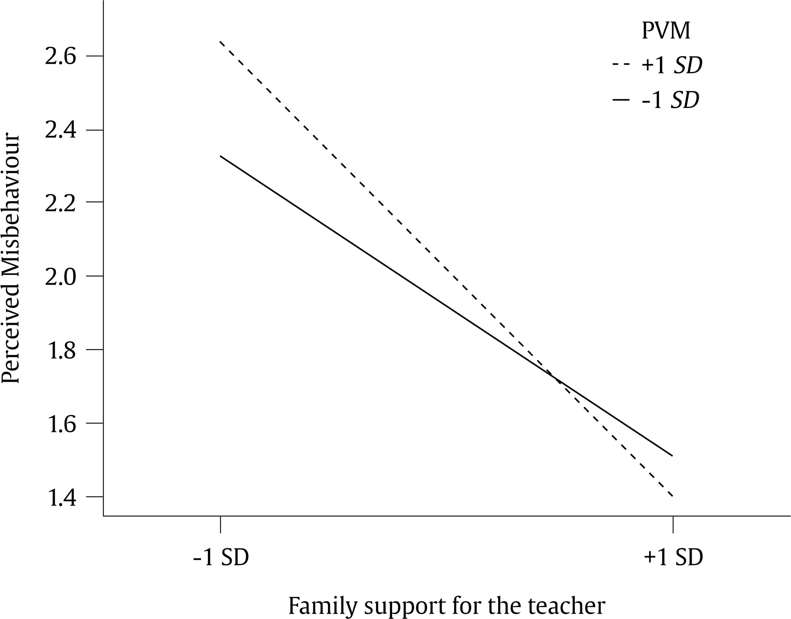 Moderating effects of coercive treatment perceived by students. Studying the interactions between levels also showed that students perception of coercive treatment acted as a moderating variable for the relationship between misbehaviour and family support perceived by teachers. In particular, high support from families was associated with low levels of perceived misbehaviour. However, when family support was low, disruption was greater (or lesser) as students perception of coercive treatment from teachers increased (or decreased). These results coincide with those obtained in the majority of research published in recent decades in this area regarding the role of coercion, which has reported that not only does coercion frequently not reduce misbehaviour levels; it even increases them (Demanet et al., 2012; Jennings et al., 2009; Morrison, 2018; Slocum et al., 2017; Wallace et al., 2014; Sun, 2015; Wang & Degol, 2016).