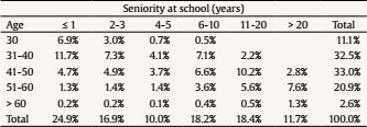 Out of the group of valid responses, 56.8% came from women and 43.2% from men. Responses were divided into 31.1% who taught at private centres and 68.9% teaching at public schools. Of the latter, 64.9% were permanent members of staff and 35.1% were teachers with fixed-term contracts. Distribution of respondents in terms of age and seniority is presented in Table 1.