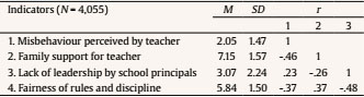 The results of the descriptive analyses and correlations for level-1 school indicators are shown in Table 2. Taking into account that the values for each indicator were transformed into a scale from 0 to 10 to facilitate their interpretation, we observe that the dependent variable of perceived disruption has a value that could be considered low (M = 2.05) were it not for the negative implications of this type of behaviour. Perception of family support for the teacher has the highest average value. Fairness of rules and discipline scores almost 6, indicating that fairness and compliance with rules were not perceived as highly present at the centres. Finally, lack of leadership from schools principals had a low-medium value, though higher than would be desirable.