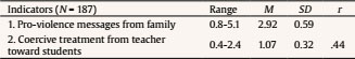 With respect to level-2 indicators, the aggregated data for the 187 centres (see Table 3) shows a relatively high presence of family advice on the use of violence, while coercive treatment by teachers toward students scores low but remains clearly present.